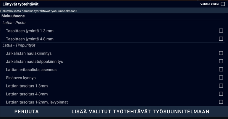 Mikäli valittuihin työtehtäviin on saatavilla niihin liittyviä työtehtäviä, näytetään ne ja ne voidaan valita heti alkuperäisten työtehtävien lisäämisen jälkeen.