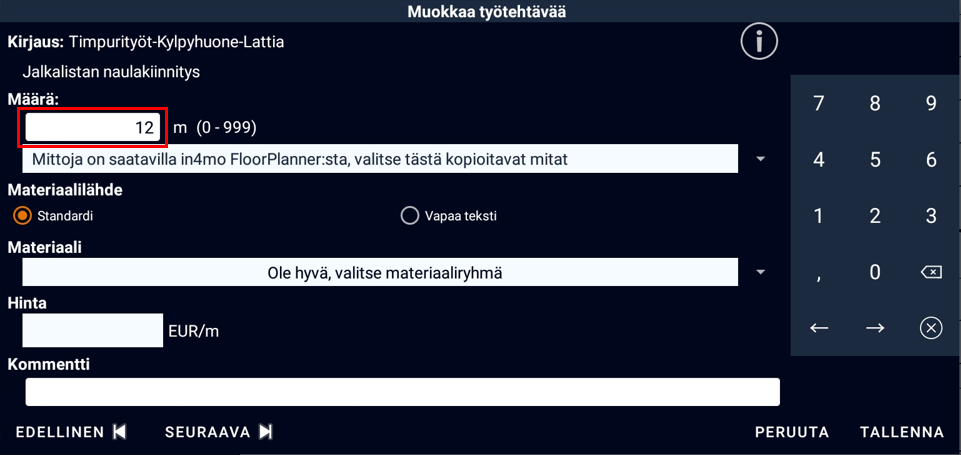 Määrät ja/tai materiaalit voi lisätä työtehtävään tai muuttaa työtehtävissä, joihin on jo lisätty määrä, painamalla kyseistä työtehtävää. Avautuvaan ikkunaan voi kirjoittaa summan manuaalisesti, tai voi käyttää pohjapiirroksen mittauksia, mikäli on luonut pohjapiirroksen in4mo FloorPlanner -ohjelman avulla kartoituksen aikana.