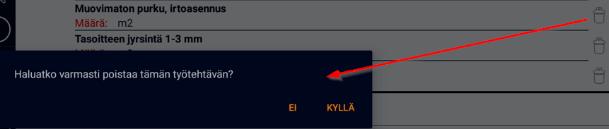 Mikäli haluaa poistaa työtehtävän, tämä tehdään painamalla poistettavan työtehtävän oikealla puolella olevaa roskakorikuvaketta. Näyttöön ilmestyy ponnahdusikkuna, jossa pyydetään vahvistusta. Työtehtävä poistetaan painamalla KYLLÄ.