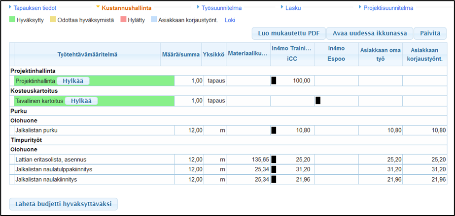 Kun työsuunnitelma on valmis ja sen haluaa lähettää hyväksyttäväksi, se tehdään Kustannushallinta -välilehdellä. Kustannushallinta -välilehdellä, näkee työsuunnitelman ja suunnitelman alla on painike “Lähetä budjetti hyväksyttäväksi”. Tätä painiketta painamalla, saa budjetin lähetettyä hyväksyttäväksi.