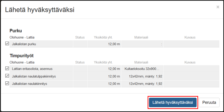 Kun valinnat ovat tehty, painetaan TALLENNA oikeassa alakulmassa, jolloin palaa takaisin työsuunnitelmaan, jossa määrä ja/tai materiaali on lisättynä. Huomioitavaa on, että summa on saatettu lisätä myös muihin työtehtävään liittyviin työtehtäviin, samaa mittaa käyttäen. Samat määrät lisätään automaattisesti muihin työtehtäviin, joilla on sama yksikkötyyppi (esim. m) ja jotka ovat samassa huoneessa ja rakenteessa (esimerkiksi kylpyhuoneen lattia).