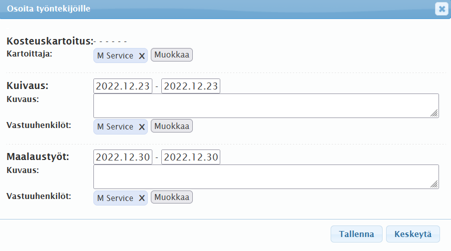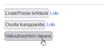 Kun päivämäärät (Vahingon sattumispäivä ja Tilauspäivämäärä) on määritelty, voidaan ruudun alalaidassa lisätä/poistaa tehtäviä ja osoittaa niitä toimistoille. Tämä onnistuu myös myöhemmin.