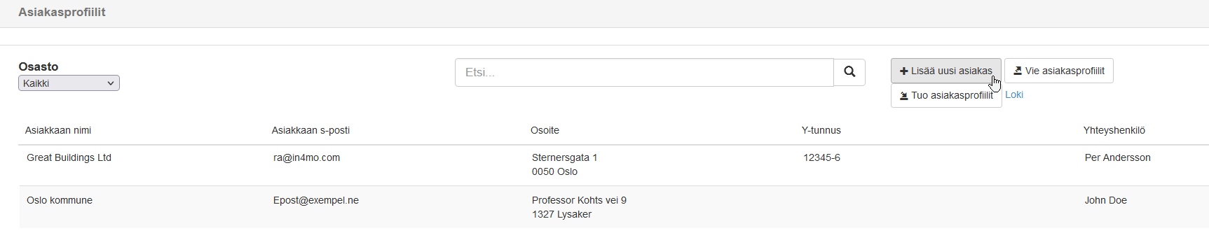 Tämä avaa asiakasprofiilisivun, jossa näkyy kaikki jo luodut asiakasprofiilit ja täällä voi lisätä uusia profiileja. Täällä on myös hakukenttä asiakasprofiili(e)n hakemista varten, sekä mahdollisuus tuoda ja viedä asiakasprofiileja. Asiakasprofiileja vietäessä avaa järjestelmä .xlsx -tiedoston (Excel -tiedoston), joka sisältää kaikki portaalissa olevien asiakasprofiilien tiedot. Tätä tiedostoa on mahdollista käyttää pohjana myös profiilien tuomiseen, mikä mahdollistaa usean profiilin luomisen/tuomisen kerralla. Mikäli tuonnin kanssa ilmenee ongelmia, kertoo asiakasprofiilinäkymän loki syyn tuonnin epäonnistumiseen.