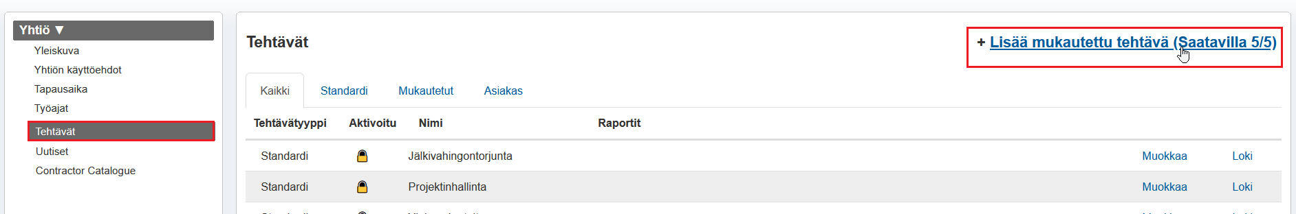 Contractor Pro:ssa on mahdollista luoda omia ns. mukautettuja tehtäviä, joita voi käyttää omissa tapauksissa. Mukautetut tehtävät lisätään tapaukselle samalla tavalla kuin muita tehtäviä. Mukautettuja tehtäviä luodaan kohdassa Yrityksen pääkäyttäjä >> Yhtiö >> Tehtävät. Täällä näkyvät kaikki portaalin standarditehtävät, jotka löytyvät portaalista oletusarvoisesti, sekä mahdolliset mukautetut tehtävät. Eri välilehtien avulla on myös mahdollista tarkastella standarditehtäviä ja mukautettuja tehtäviä erikseen, sekä nähdä ja lisätä raporttipohjia asiakasprofiileihin. Uusia mukautettuja tehtäviä luodaan painamalla oikeassa yläkulmassa olevaa +Lisää mukautettu tehtävä kohtaa.