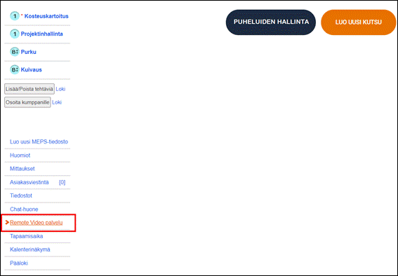 Kun tapauksen avaa in4mo Building Claims -portaalissa ja palvelu on käytössä, Remote Video -palvelu löytyy vasemman laidan valikosta.