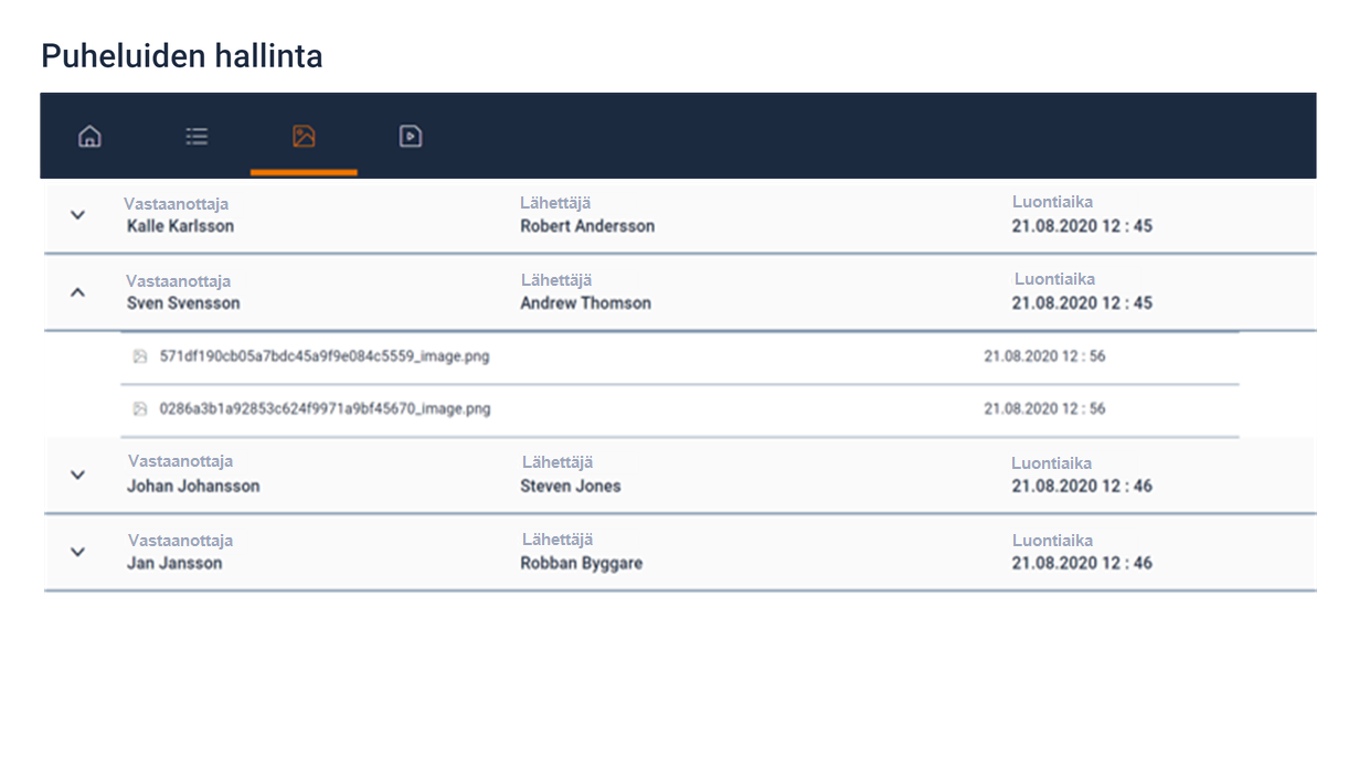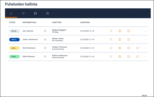 Päättyneen puhelun jälkeen, puhelun sisältöä voi tarkastella joko Puheluiden hallinta -näkymästä tai avaamalla siihen liittyvän tehtävän multimediatiedot tai tapauksen tiedostot, jos kutsulle ei valittu tehtävää.