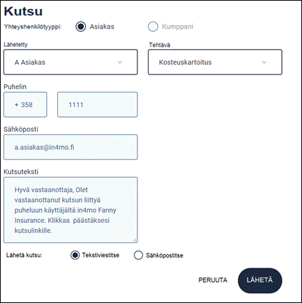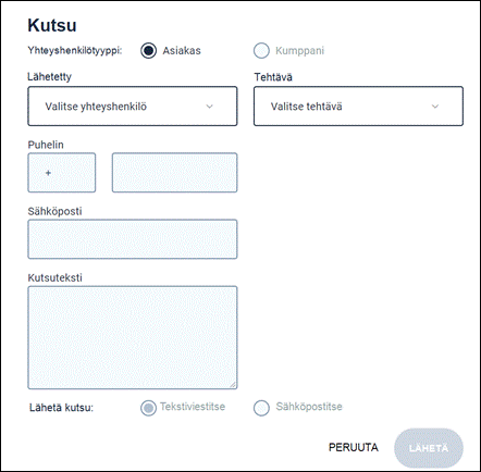 Kutsunäkymä avautuu, ja yhteyshenkilö sekä kutsun lähetystapa valitaan.