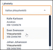 Kun kutsun vastaanottaja valitaan, kaikki tapaustiedoissa mainitut yhteyshenkilöt ovat käytettävissä pudotusvalikossa. Kutsuttavan tiedot siirtyvät kutsunäkymään heti kun yhteyshenkilö on valittu.