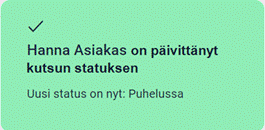 Kun yhteyshenkilö avaa vastaanottamansa kutsun ja siihen kuuluvan linkin, tapauksen status muuttuu statuksesta KUTSUTTU statukseen PUHELUSSA. Näytön oikeassa alakulmassa näkee myös ilmoituksen siitä, kun yhteyshenkilö on avannut linkin. Tämä ilmoitus katoaa automaattisesti muutaman sekunnin kuluttua.