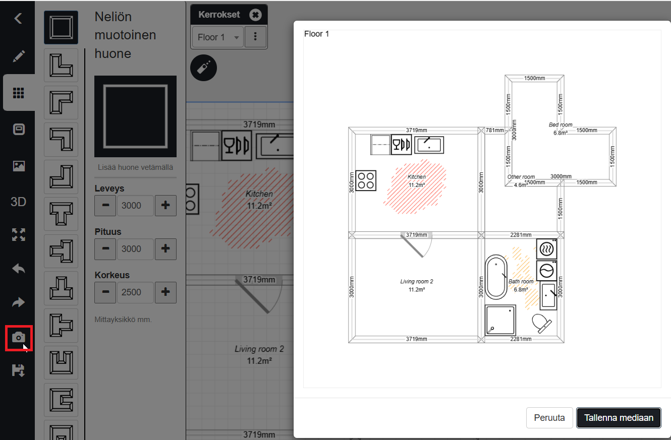Siirtynyt FloorPlanner valikko ja kuvakaappausmahdollisuus 2D näkymässä