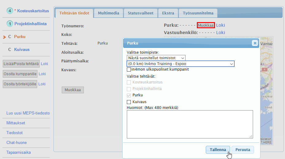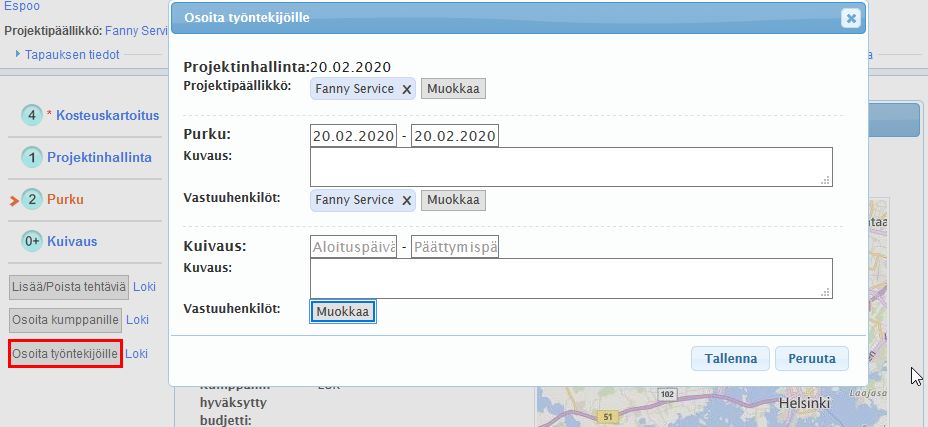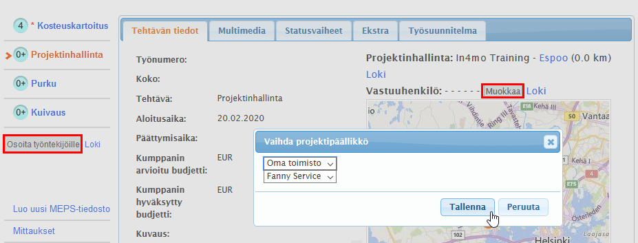 Osoittaaksesi tapaukselle projektipäällikön, paina projektinhallintatehtävässä kartan yläpuolella olevaa Muokkaa painiketta. Voit myös osoittaa projektipäällikön tapaukselle painamalla oikeassa laidassa, tehtävien alla olevaa Osoita työntekijöille painiketta.