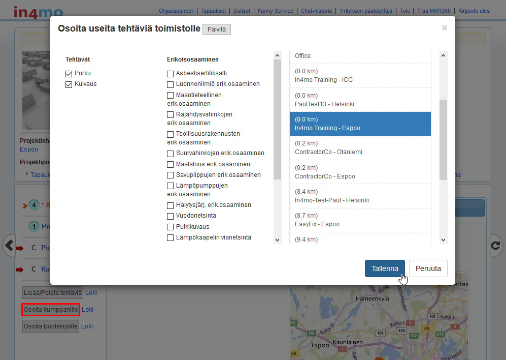 Valitse Osoita kumppanille, kun haluat osoittaa useampia tehtäviä samalle yritykselle (tai kumppanille). Valitse yritys luettelosta ja paina Tallenna.