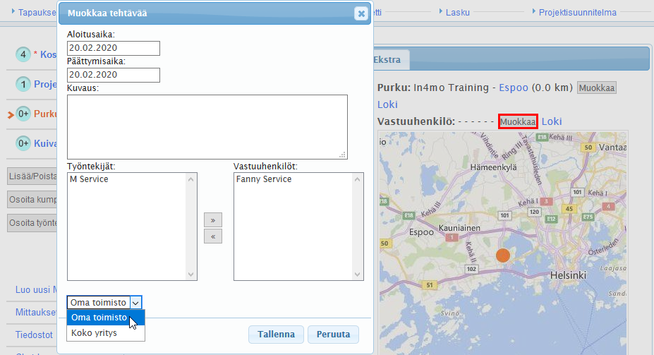 Valitse tehtävä, jonka haluat osoittaa vastuuhenkilölle painamalla oikealla olevaa Muokkaa painiketta, osoitetun toimiston nimen alla.