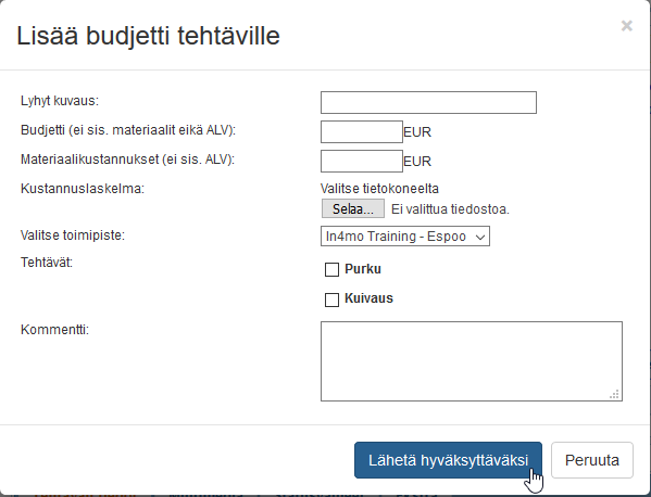 Valitse budjettiin liittyvät tehtävät. Kommentin lisääminen budjetteihin on myös mahdollista, mutta ei pakollista.