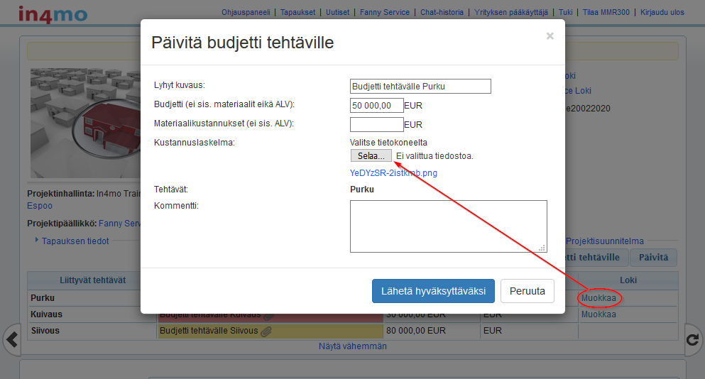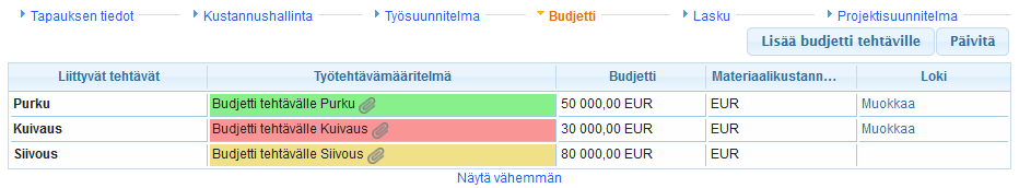 Mikäli budjettia on muokattava, siirry Budjetti välilehdelle ja valitse Loki kohdasta Muokkaa vaihtoehto, tehtävän oikealla puolella.