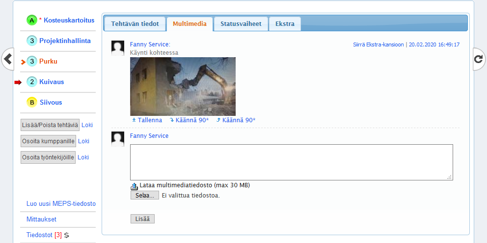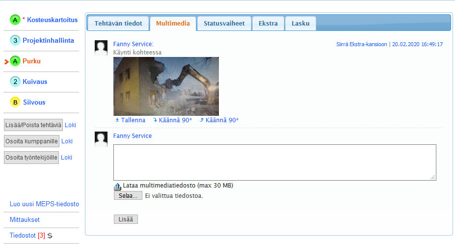 Sinulla on projektinhallinta-tehtävä mobiilisovelluksessa, jossa voit tarvittaessa raportoida vahinkokohteesta. Raportoidut tiedot näkyvät tehtävän Multimedia välilehdellä, kuten missä tahansa muussakin tehtävässä.