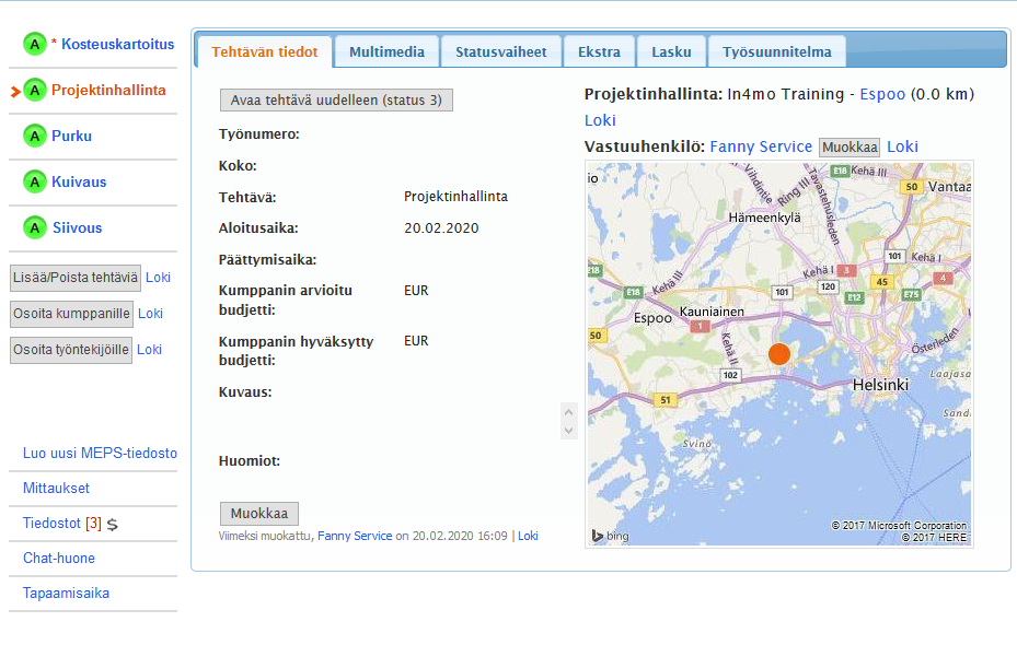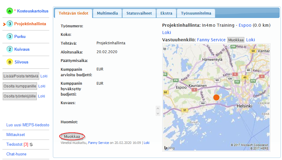 Jos projektinhallintatehtävän tietoja on muokattava, on se mahdollista klikkaamalla Muokkaa -painiketta, Tehtävän tiedot -välilehdellä.