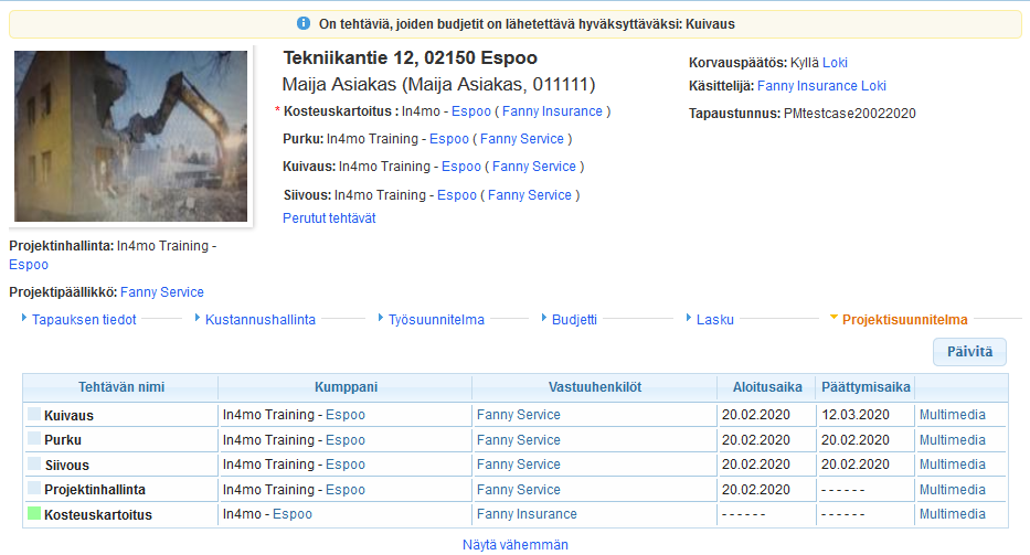 Mikäli korvauspäätös on hyväksytty ja projektipäällikkö on valittu tapaukselle, tehtävä muuttuu automaattisesti statukseen![]()