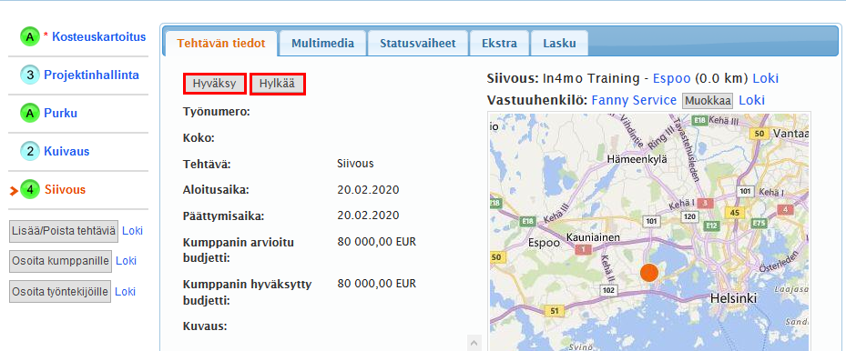 Kun kaikki tapauksen korjaustyötehtävät on merkitty hyväksytyiksi ja ovat vihreässä A statuksessa, projektihallinnantehtävän status muuttuu automattisesti statukseen 4. Hyväksy -painike ilmestyy Tehtävän tiedot -välilehdelle kun tehtävä on statuksessa 4. Hylkää -painike on myös näkyvillä, kun tehtävä on statuksessa 4. Klikkaamalla Hylkää -painiketta, tehtävän status palaa takaisin statukseen 3. Tätä toimintoa käytetään, mikäli huomataan esimerkiksi, että jotain tehtävää ei olekaan suoritettu loppuun.
