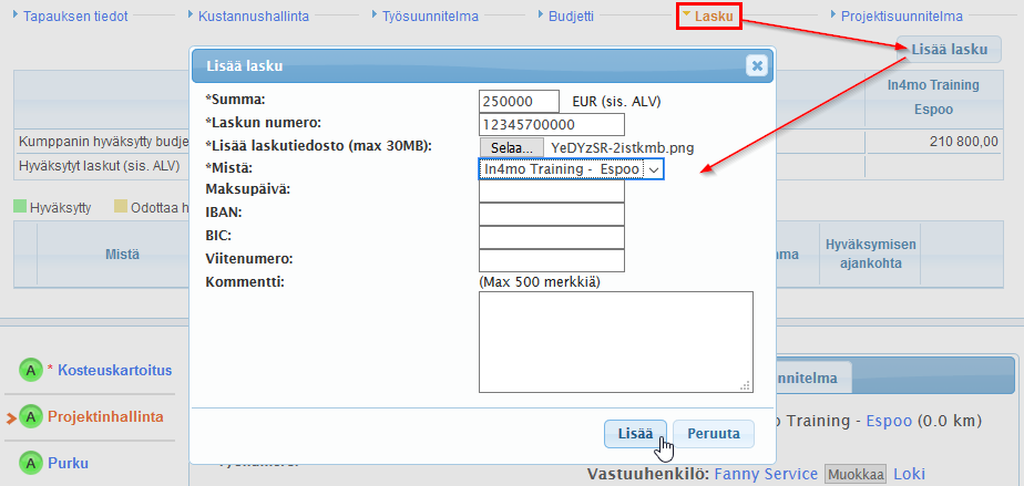 Täytä tarvittavat tiedot ja paina Lisää. Huomaa, että Summa, Laskun numero ja keneltä (Mistä) lasku on, ovat pakollisia kenttiä. Myös laskutiedoston lisääminen on pakollista. Muihin kenttiin voi halutessaan täyttää tietoja, mutta tämä on valinnaista.