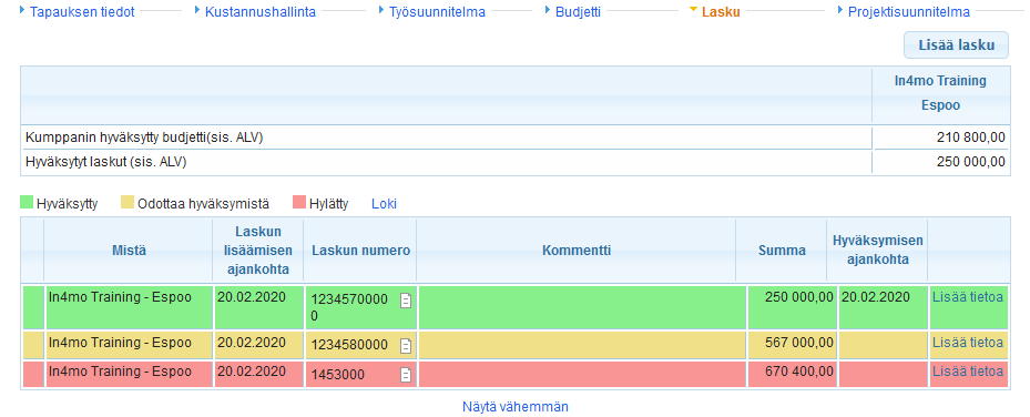 Tehtävälle osoitettu yritys vastaa myös budjetin lisäämisestä mikä tarkoittaa, että budjetin lisääminen on mahdollista vain omille tehtäville. Tehtäväkohtainen budjetin lisääminen voidaan tehdä vain silloin kun tehtävän status on ![]()