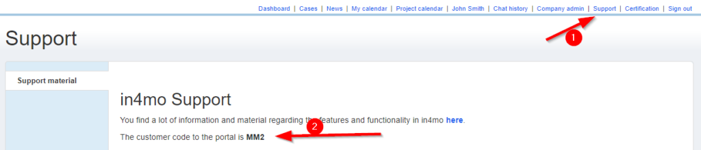 In order to log in to the Task Reporter app you need a customer code. Each web portal in in4mo has got its own code. The codes for each respective portal can be found in the portal by clicking Support in the menu bar on top of the screen.