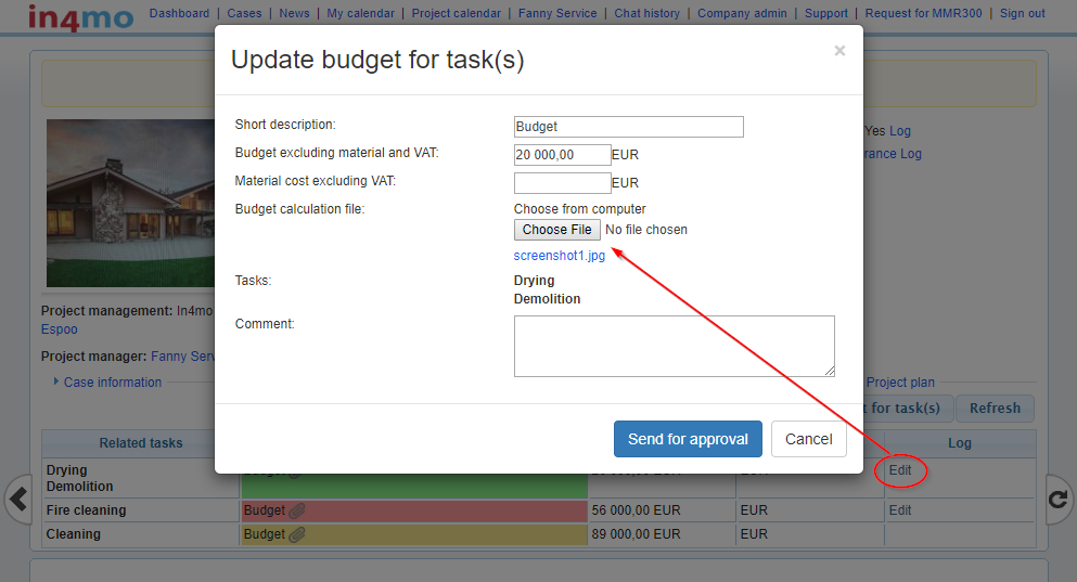 When all the information has been filled out, the next step is to click Send for approval. The task(s) which a budget has been sent in for approval, switches to status