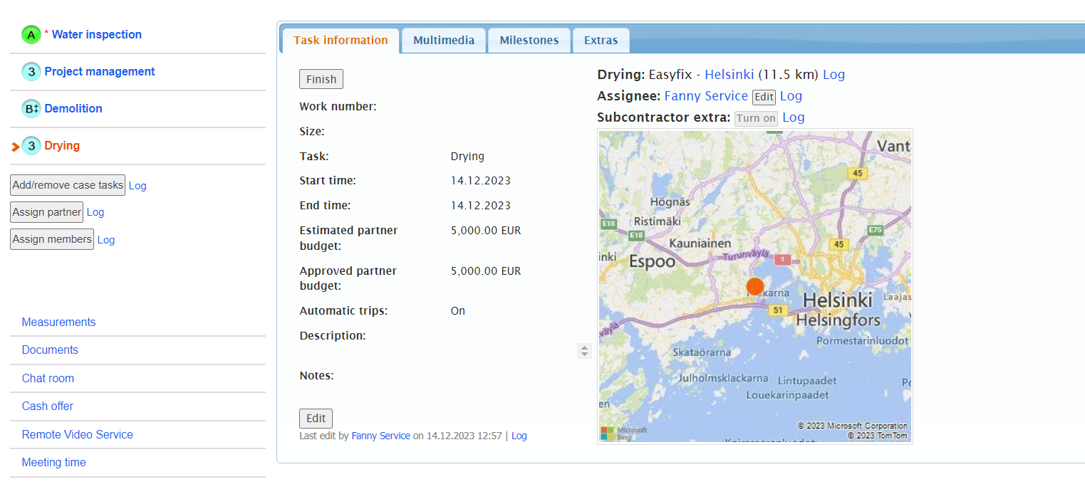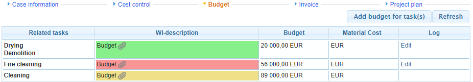 All other tasks (except inspection, first aid and project management tasks) can require a budget to be accepted by the insurance company, before the task(s) become visible and the reporting can be started from the mobile application.