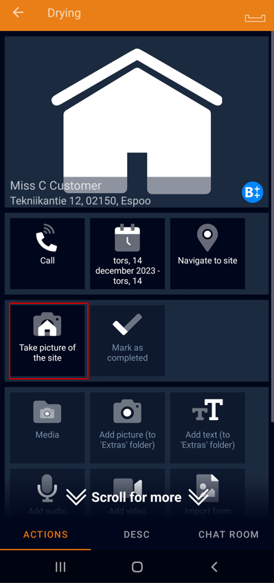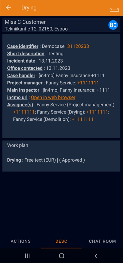 In the task’s ACTIONS tab, all the actions can be seen which can be taken for the task, in addition to the site address and the customer/contact person’s name. Phone number for the case handler and contact person(s), can be found by clicking the phone icon Call to the top left.