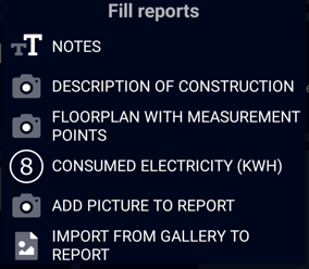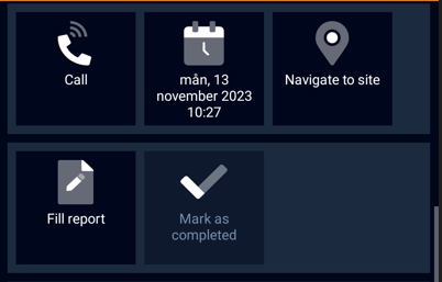 If the task has a report, the Fill report icon is visible. It shows a few options such as notes and the possibility to add texts and pictures to the task report. The report is more extensive on a tablet (more information here), so tablets are recommended for tasks with reports.