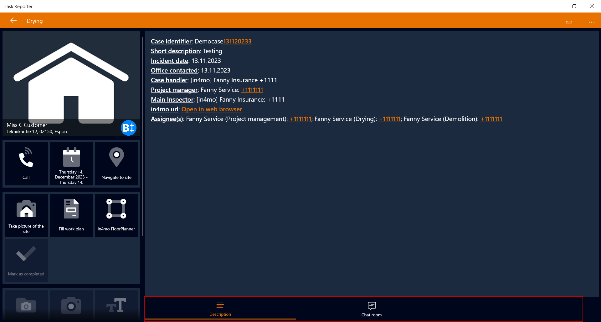 Reporting a craftsman task with the tablet, differs a little when using a smartphone. The default view when opening a task on a tablet is the Description tab, where information about the case and the task can be viewed, whilst reporting the task.