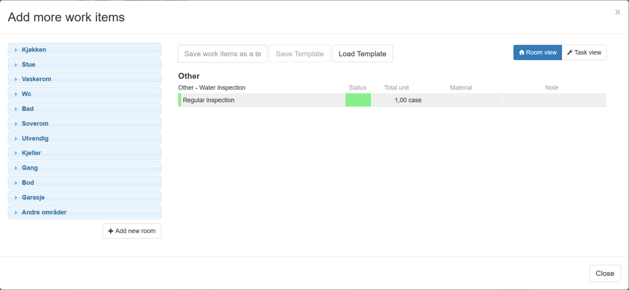 Creating a work plan this way works the same way as described above, with the main difference being that you are adding work items for the opened task only, meaning that you won’t have the possibility to toggle between a room-based and a task-based view.