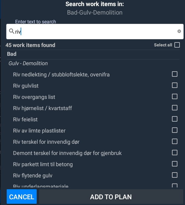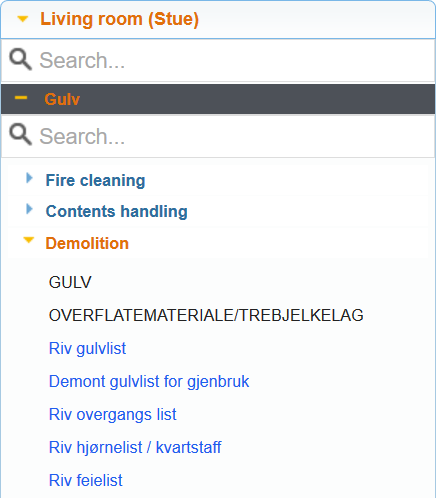 When you select a room, a new list will appear underneath this room, where you can select structure, e.g. floor, wall, door etc. When you have selected the structure, you will see a list of relevant tasks, e.g. demolition and carpentry work. When you have selected a task, you will then see all relevant work items based on the choices you have made in the list.