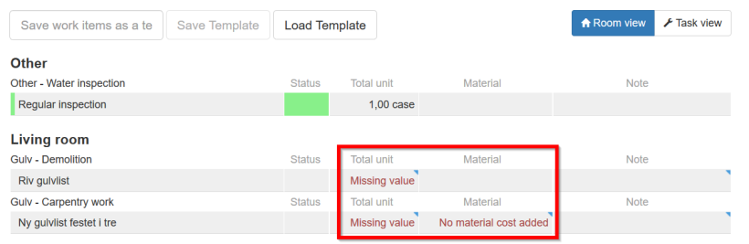 When you add work items, you will see that they are missing values. Work items which are missing values are indicated with red text in the column Total unit. For work items which could have material costs, it will also be indicated with red text if no materials have been added yet. To add values, simply click on the row for the work items under the column Total unit. When you add a value to a work item which has related work items in the work plan, the input value will be applied also to the related work items.