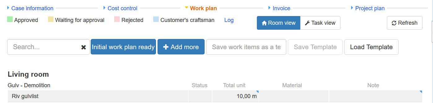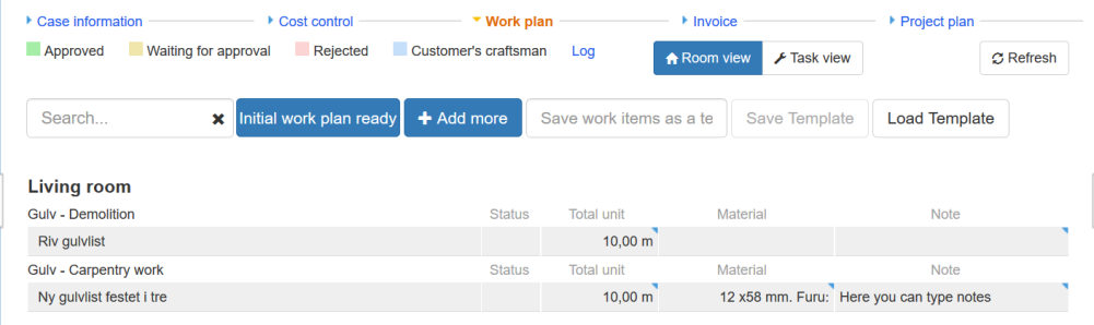 Under Work plan you will see all work items added to the case. You can add more work items from here, add or change amounts for added work items, add materials, delete work items, as well as saving and loading templates.