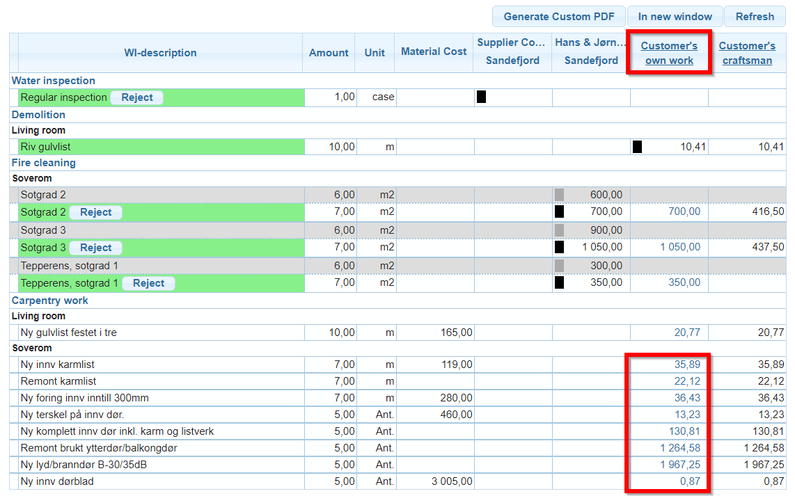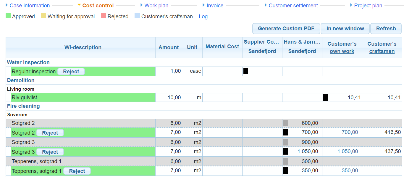 In the Cost control you find two columns to the right of the table: Customer’s own work and Customer’s craftsman. The latter is an optional feature, so if you can’t see this column, this feature is not in use in the portal.