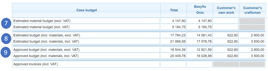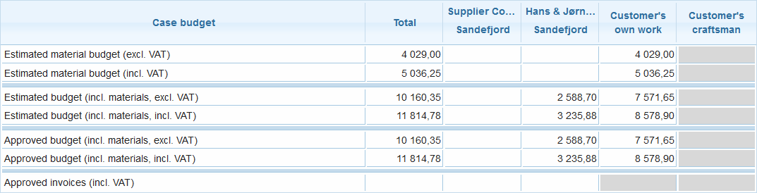 The third table shows the total costs for each company and the customer, and is broken down into showing the estimated material budget, with and without VAT, the estimated total budget including materials, both with and without VAT, and the sum of the budget which has been approved.