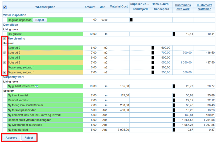Budgets are approved or rejected under Cost control. Users who have the permission to approve budgets will see checkboxes next to work items that have been sent for approval. When marking a checkbox two buttons appear below the table; Approve and Reject. Work items that are approved turn green, while rejected items are marked in red. Yellow indicates work items which are waiting for approval. Work items in white are in draft status and cannot be approved before they are sent for approval.
