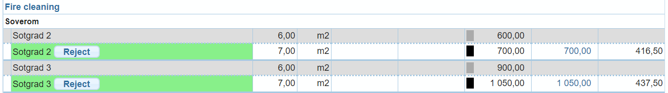 It is important to note, that items that are not directly connected to the physical work, such as Project management, travels and extra fee for material handling, are often added to the calculation automatically. They are not shown in the work plan, but in the Cost control page, and will be explained in further below. The precise calculation logic of these compensations depends on the agreement between insurance company and the service company responsible for the given task.