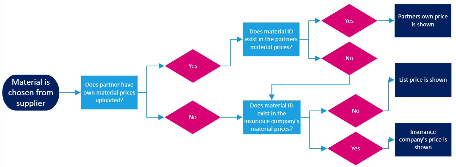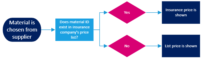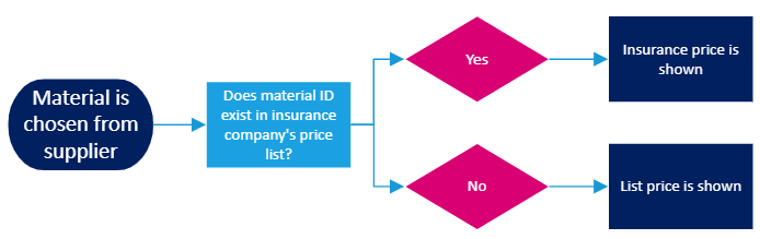 Which price that is shown for a given material in a given case, depends on different factors, such as status of the task and portal settings. Below are diagrams for which price will be shown: If portal is not configured to always use insurance company’s own prices Work item is assigned to partner: Work item is unallocated or allocated to customer’s own work: