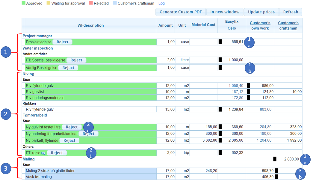 9. Approved budget shows the cost for work that is approved. The calculations for partner, customer own, and customers craftsman should be done as in dot 8.Estimated budget, but only for work marked as approved or assigned to Customer craftsman, i.e. marked with green or blue colour in the Cost control table.