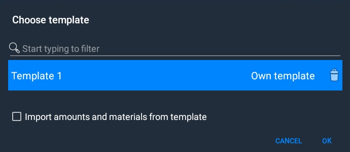 If you wish to import work items from a template, click on Load template. You will then see a list of available templates, both own templates, as well as shared templates. For own templates you will also see a red cross on the right-hand side, which can be clicked if you wish to delete the template. Select the template you wish to import to your workplan, then select which room the work items should be imported to, as well as whether amounts or materials should be imported from the template as well. If these boxes are unchecked, only the work items will be added to the work plan, while you have to add amounts and/or material manually. When you are ready, click on Apply Template to import the work items from the template.