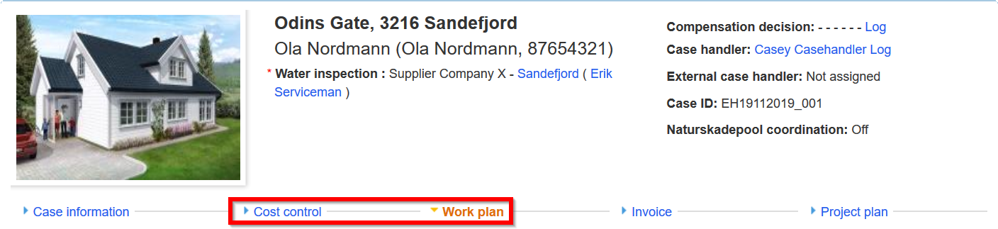 In the web portal you will find two tabs which are related to iCC; Cost control and Work plan. The former displays actual costs and will be explained further later on. It is under Work plan that the work plan is made. To open the work plan, simply click on Work plan. Note that the availability of this button depends on what kind of role you have in the case. If you have been assigned to an inspection or project management you will see this button, if you have been assigned to a craftsman task only, you find the work plan in a different place, which is explained further in the section Creating a Work Plan for a Craftsman Task and Sending for Approval.