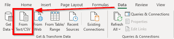 Open Microsoft Excel, then click on ‘Data’. You will see a button called ‘From Text/CSV’. Click this button, browse to where you have saved the downloaded file, select the correct file, and click ‘Import’.