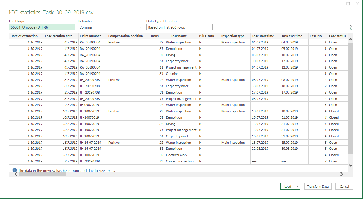 When Excel has loaded the file, a window will pop up where you check that the file origin is in Unicode (UTF-8), and that the delimiter is set as ‘Comma’. The table below is a preview of how the file will look when loaded. When ready, click on ‘Load’. The file is now ready for use.