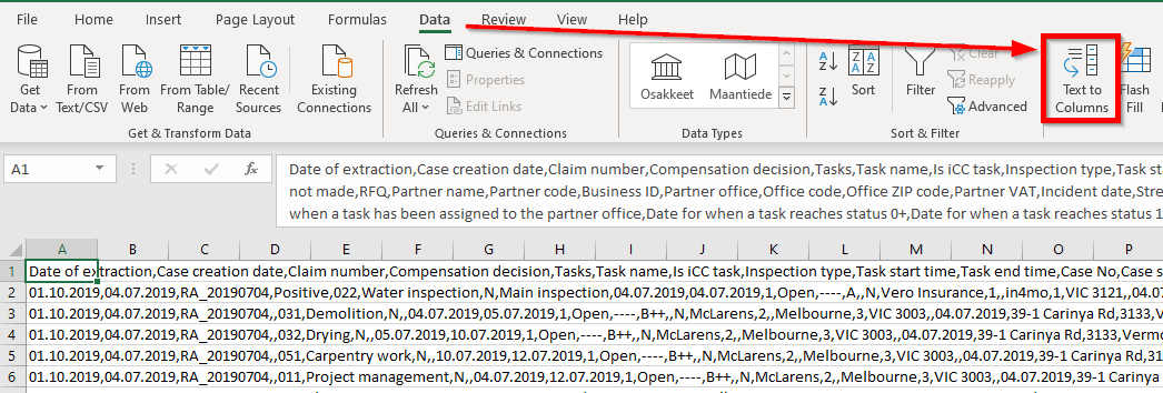 If you have chosen to open the downloaded file directly, you may find that all content is found in column A of the Excel file. To fix this, click ‘Data’ from the top menu in Excel, then click ‘Text to Columns’.