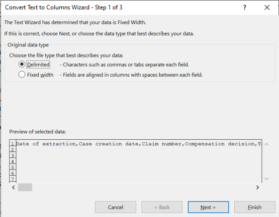 A new window will open. Under ‘Original data type’, select the first option (Delimited), then proceed by clicking ‘Next’.