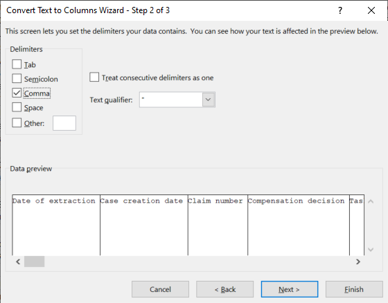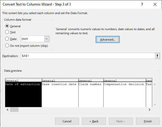 In the third and final step, select ‘General’ as the column data format, then click ‘Finish’. The file is now ready for use.