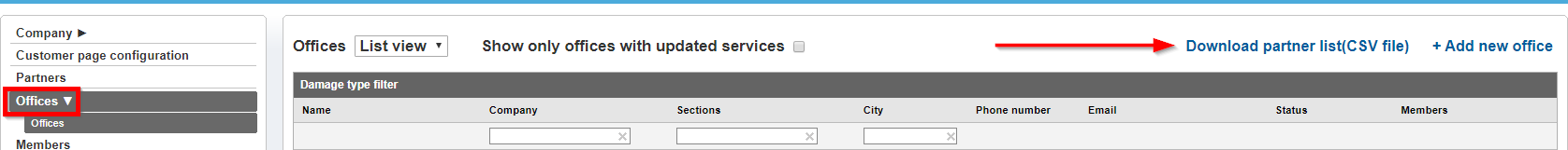 The partner list is available to users with authority level 6 (Contractor) or level 4 (Building Claims) and is found under ‘Offices’. Click on ‘Download partner list (CSV file)’ to download the file.