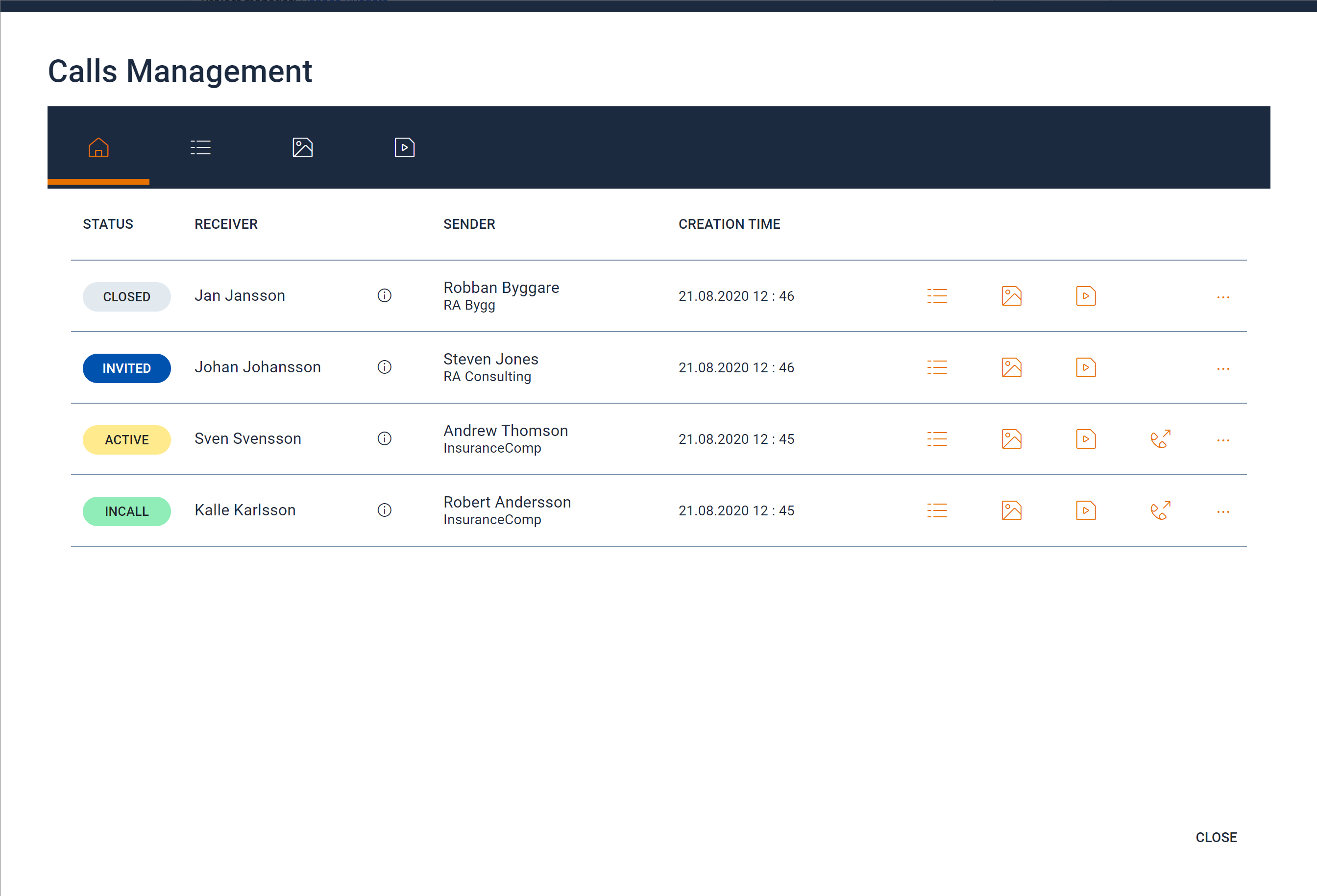 When clicking on the Calls Management button you will see a list of existing invites, along with the status for each invite, the name of the person who has received the invitation to the video call with information about phone number or email address the invite was sent to, who sent the invite, when the invite was created, as well as case action buttons, which will be explained further down.